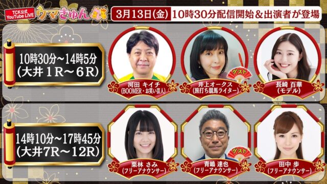 競馬動画 TCK公式LIVE「ウマきゅん」2026/3/12 ※10時30分配信開始・出演者登場 2026年3月4日 admin_master https://public-gambling-ch.com/wp-content/uploads/2021/09/public-gamble-white.png 公営競技予想まとめ|ギャンブル速報 大井競馬開催日は毎日生配信! 全日程1Rから出演者が登場!! 【プレゼント応募フォーム】 https://www.tokyocityk …