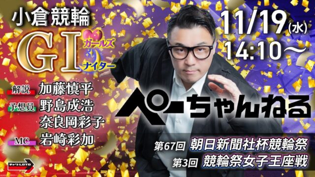 競輪動画 チャリロト公式競輪番組 加藤慎平の「ぺーちゃんねる」11/19(水)【初日】#小倉競輪 第67回朝日新聞社杯競輪祭 第3回競輪祭女子王座戦 [GⅠ♥ナイター] 2025年11月19日 admin_master https://public-gambling-ch.com/wp-content/uploads/2021/09/public-gamble-white.png 公営競技予想まとめ|ギャンブル速報