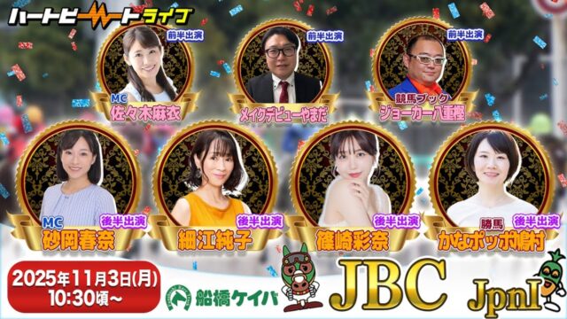 競馬動画 【船橋競馬】ハートビートライブ #221【前半 進行:佐々木麻衣/メイクデビューやまだ/解説:ジョーカー八重樫(競馬ブック)】【後半 進行:砂岡春奈/細江純子・篠崎彩奈/解説:かなポッポ鳩村(勝馬)】 2025年10月29日 admin_master https://public-gambling-ch.com/wp-content/uploads/2021/09/public-gamble-white.png 公営競技予想まとめ|ギャンブル速報