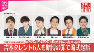 海外のオンラインカジノサイトで違法な賭博をしたとして書類送検された「吉本興業」の6人の芸人を東京区検が略式起訴しました。